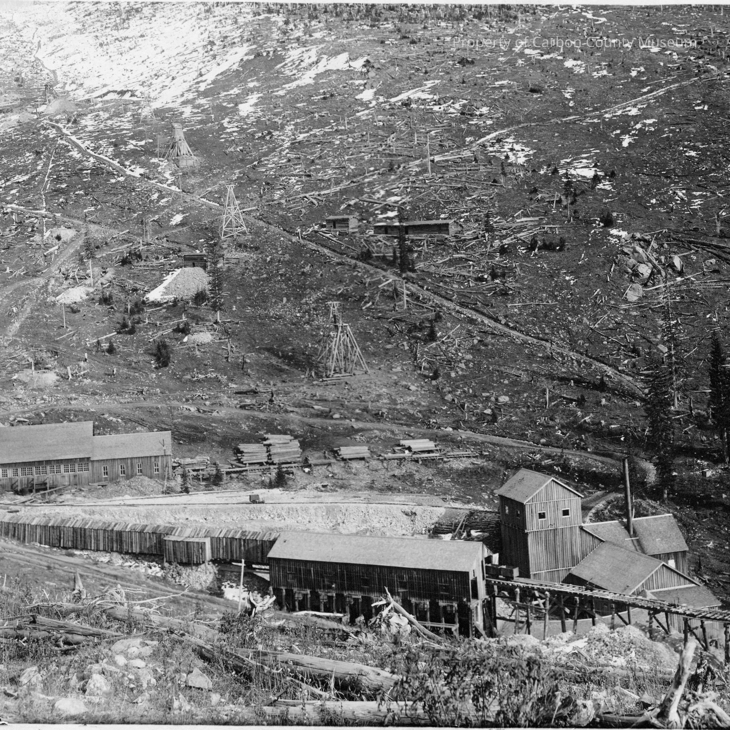 Update - 2009: Black & white print of a birds eye view of a deforested mountain area with timber strewn about on all ground areas. In the foreground are four large linear wooden buildings with high wooden trellis track structures entering building on side left of print foreground. A narrow wooden covered structure winds from this building to another building in distance at center side left. Other tracks emanate from this building & extend across side left to side right of image. Wooden tramway supports are seen extending down into the valley floor & beyond. Stacks of cut timbers are seen at image center area.