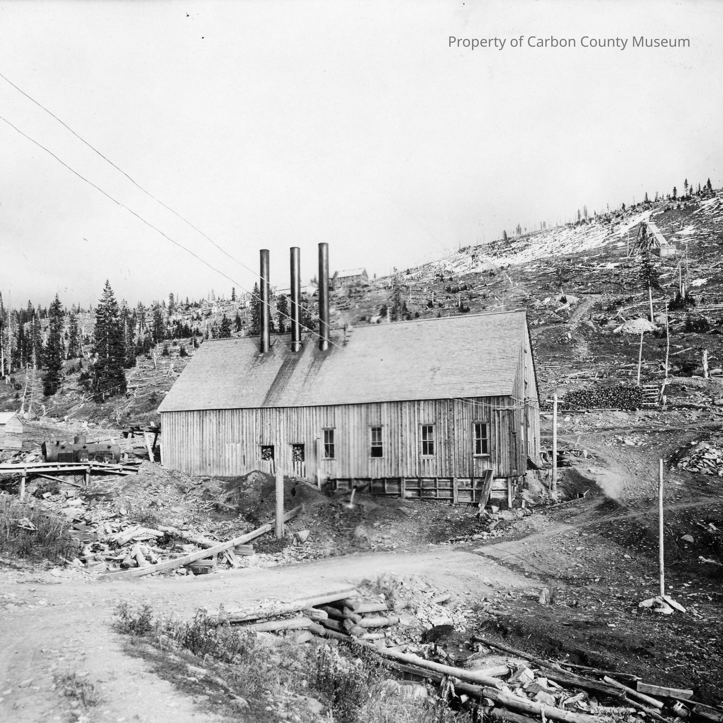 Update - 2009: Black & white glossy print of a large wooden building with a high pitched roof through which three tall vertical black smoke stacks arise. Building appears to have wooden supports at base with far side supported at ground. A deforested hill is seen in background with other wooden tripod structure & tower like structure at mid hill level. A small outbuilding is seen side left. A dirt road in foreground crosses over a timbered drainage ditch. A few evergreens are seen on side left. Printed from negative in white at lower right corner 55.
