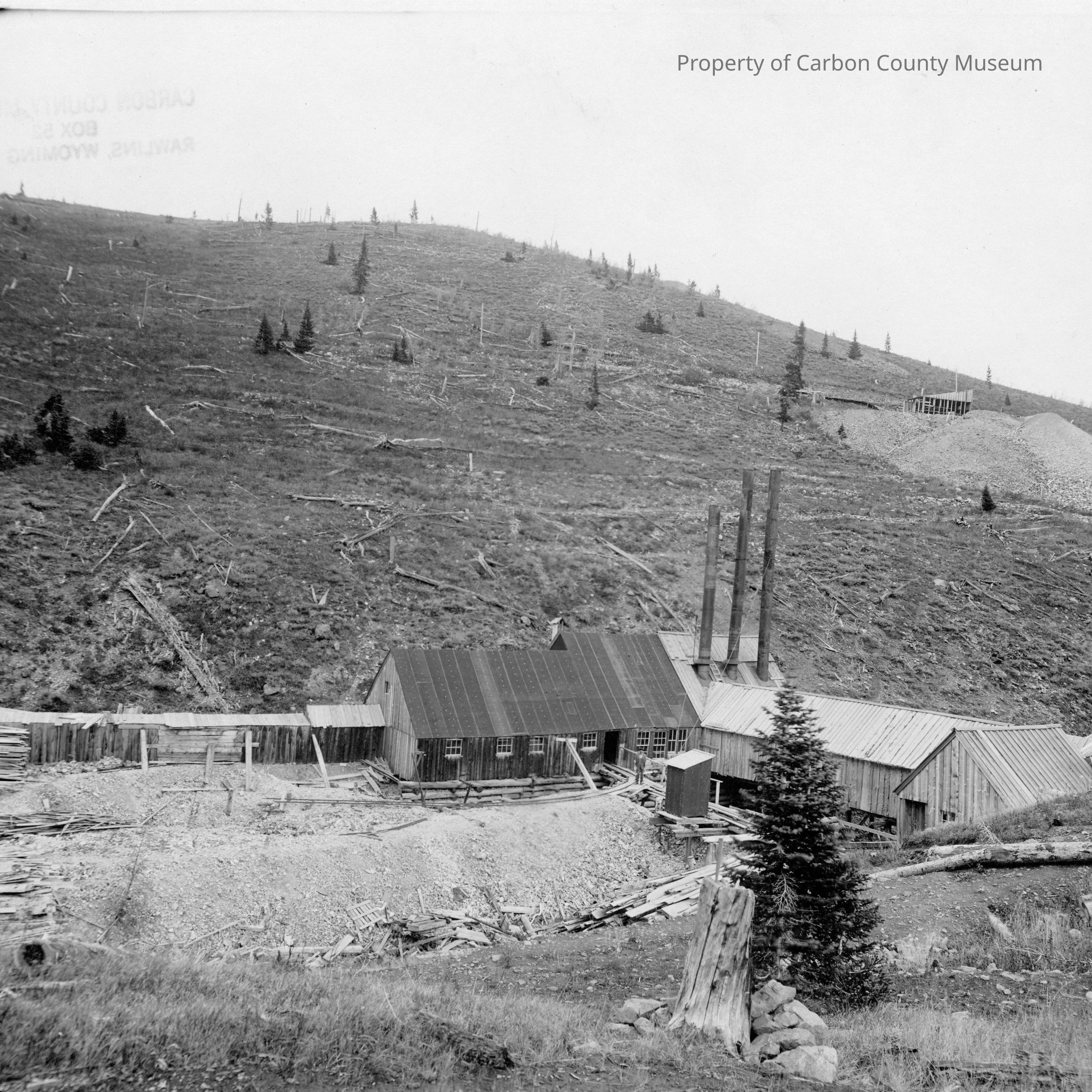 Update - 2009: Black & white print of a deforested hill with a white rocky slag pile on side left. At hill bottom are twin large wooden buildings adjoined forming a backward "L". Attached to the lower darker building on roof are three large chimney pipes. At side left of this building is a large narrow wooden short structure which extends into border of side left of print. In the center front of this area are piles of cut lumber, rock piles, an outhouse? and a narrow two rail track emanating from doorway of the dark wooden building and extending to photo left. A standing man; is barely visible on the track at the doorway. Other lumber is seen strewn about at various places as well as stacked cut timbers on side right.