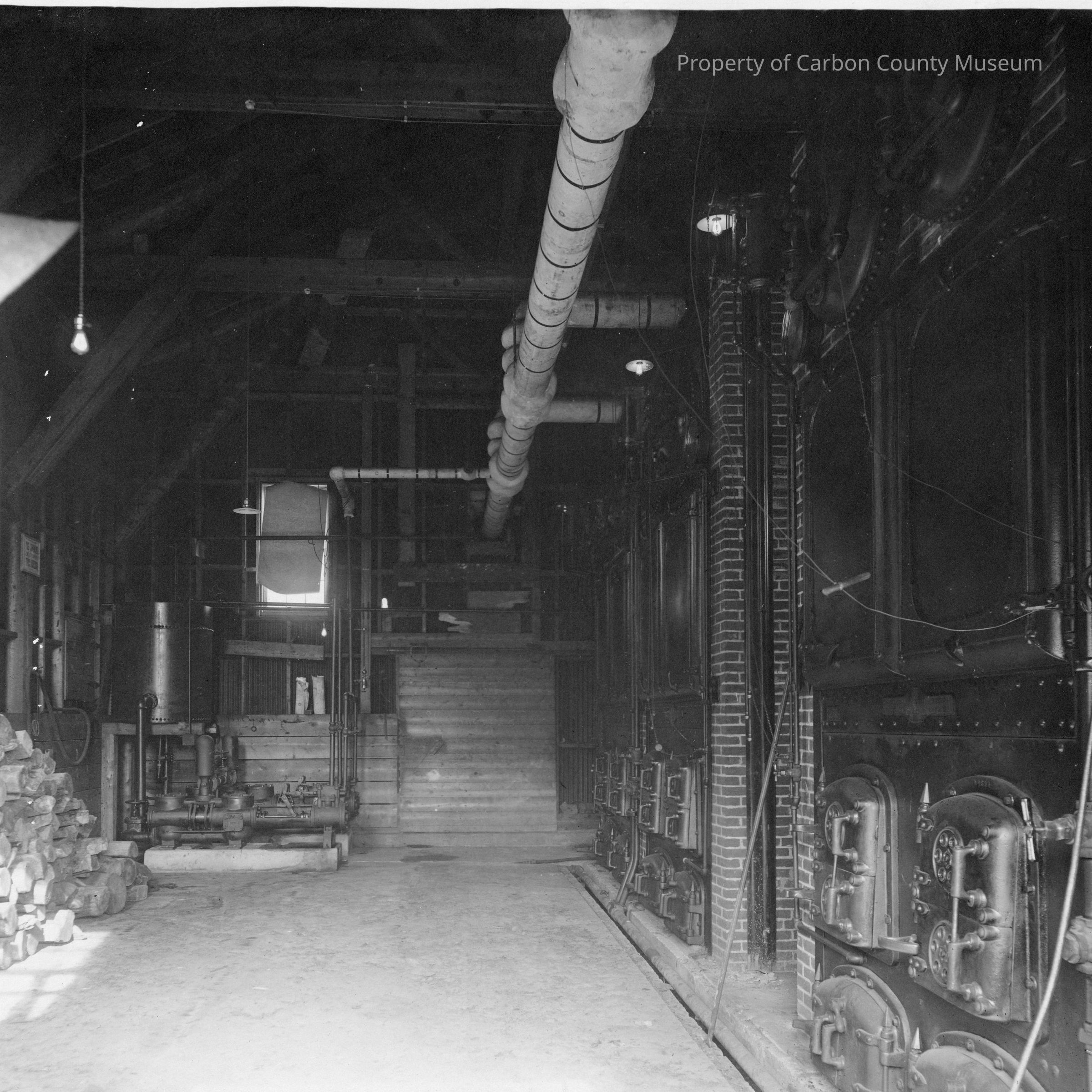 Update - 2009: Black & white print of the interior of a brick & wood building with lights hanging from a beamed ceiling with suspended large white pipes running lengthwise and several crosswise into this large ceiling. Small suspended pipe from sidewall. Dark medal wall equipment with doors are built into brick wall side right. At rear of side left is seen a boiler? and other machinery units. At rear of room are stacked beams. a window with ragged shade covering is above the beams. Cut logs are at foreground left. Floor appears to be concrete.
