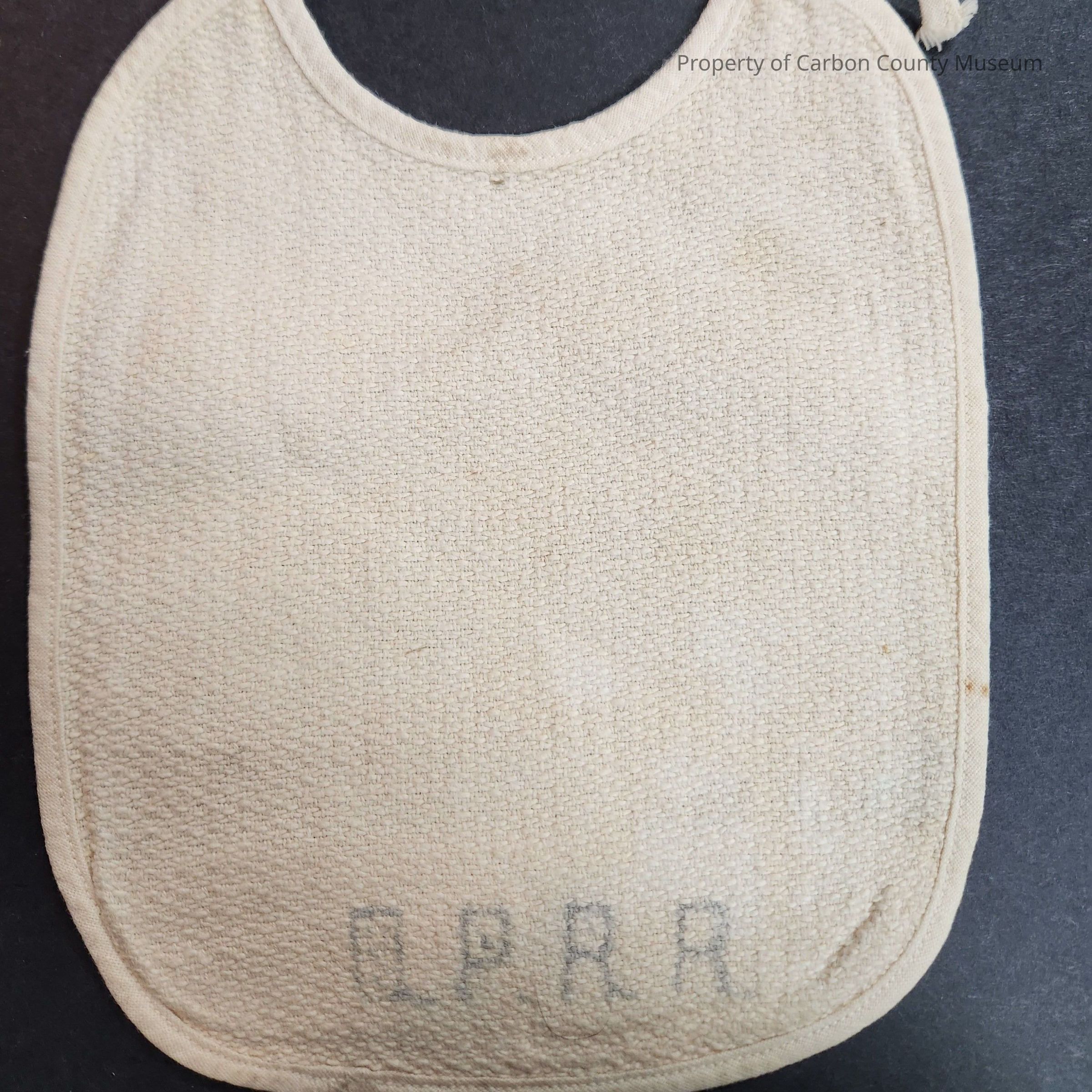 White baby bib, "U. P. R. R" is printed along the bottom, the reverse features a small pocket.
