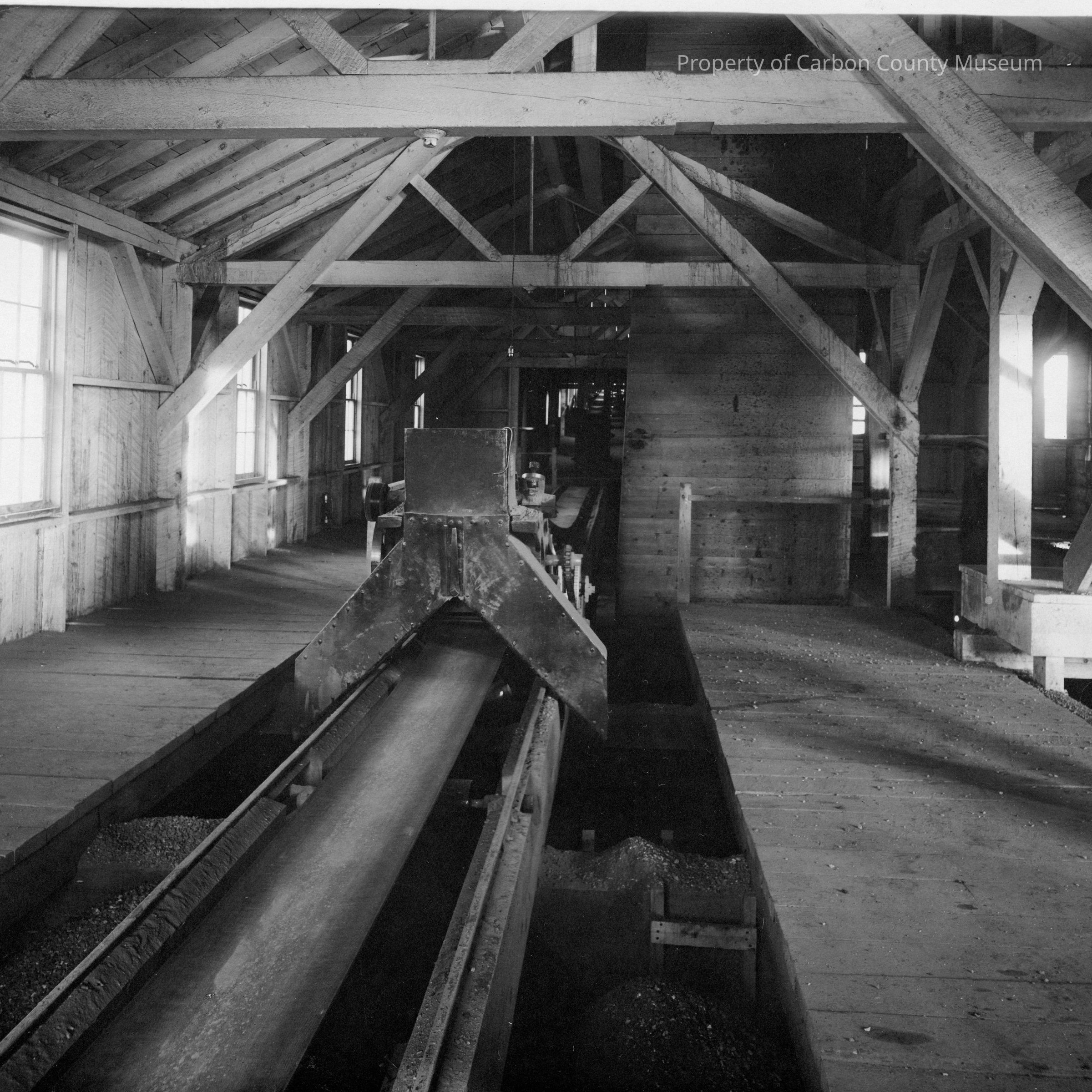 Update - 2009: Black & white print of the interior of a wooden wall & beamed ceiling room which has a very long conveyor belt with metal side rails which extends into the distance. A large metal unit shaped like an inverted Y is placed over the conveyor belt at mid center of image. There are tall panel windows on side left spaced at intervals down the long wall area extending into the distance. The floor is made of wooden planks & has small pebbles strewn about. There appears to be an open area between conveyor belt & floor. A small pile of gravel? is seen at center of image in this crevice.