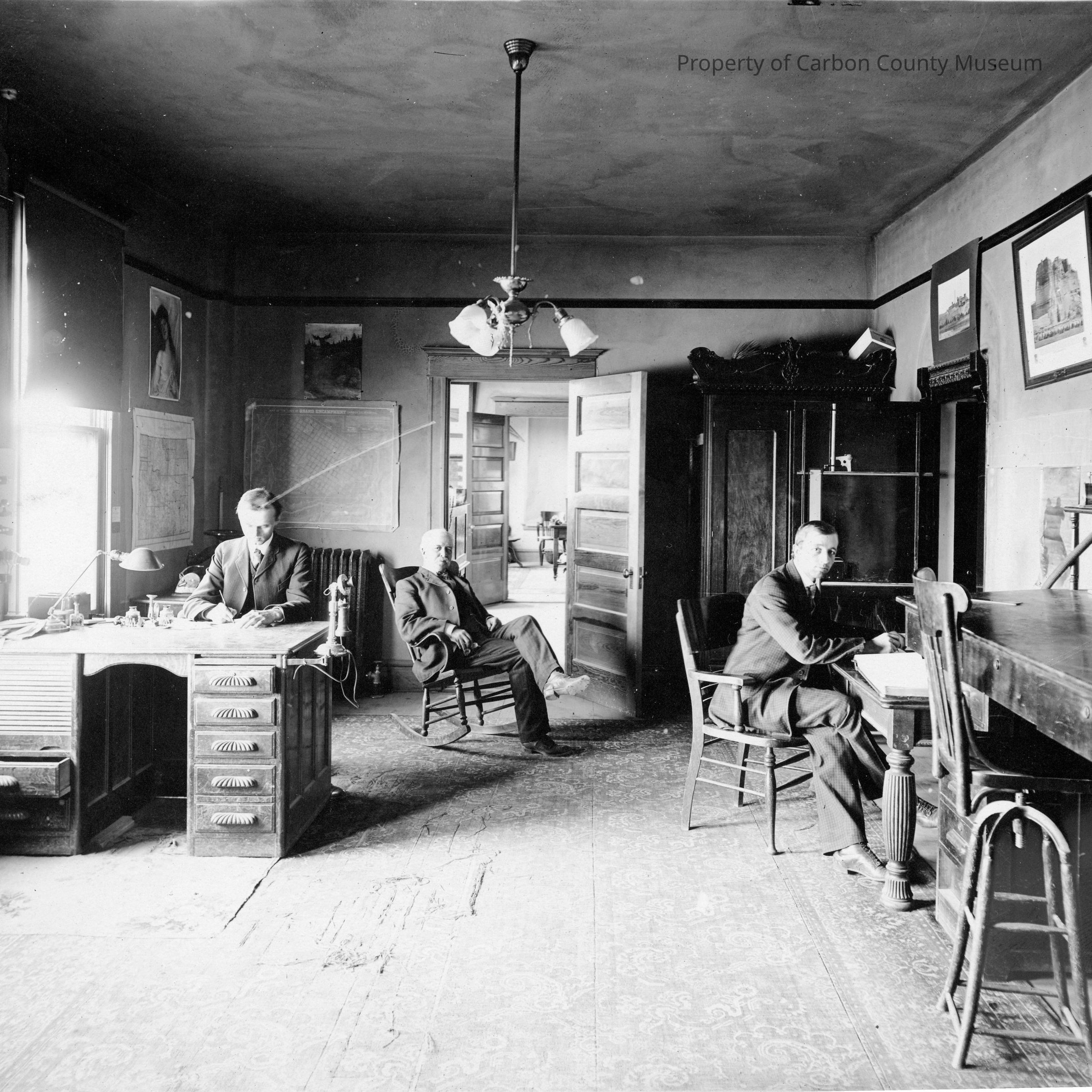 Update - 2009: Black & white print of the interior of an office showing three men dressed in three_piece suits. Man on side left is seated at a two-sided desk, writing. A candlestick telephone is attached to side right of desk. A wall radiator is behind him. The second man is seated in a wooden rocking chair at mid center of image with his arms resting on arms of chair & his legs crossed. The third man is sitting in a wooden chair at an ornate table writing in a ledger on image side right. A high drafting table with chair/stool is in foreground right. The patterned carpet is extremely worn. The walls have a variety of images displayed; photos, maps, calendar, pictures, etc. A door is ajar in background & one can see into an anteroom & into another office. A light fixture hangs from ceiling at mid ceiling & a decorative 3-tulip shaped covers four bulbs.
