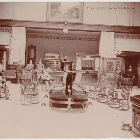 A sepia toned photograph of a Harvey House-1884- Lobby shot. 8" x 5 3/4" depicting a check-in desk, 2 men sitting in rockers. Spittoons are located at various spots and there are empty rocking chairs throughout the center of the room. with a double row of back to back more stately looking stationary chairs in between the rockers lined on each side. There are men standing against check-in desk with a man and a lady behind the desk. All people are facing the camera.