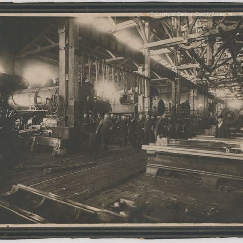 A black and white print attached to a dark gray matboard which has been cut down and now has irregular margins. It has a small three black line border surrounding the print. The image is of the machine shop of Union Pacific Railroad in Rawlins,Wy. The large open workroom has a large beamed structured open ceiling. There are open bays with locomotives posititioned in two of them and possibly three. A large group of workmen are dressed in coveralls on side left by the engines. On side right standing between long, raised table like structures is a man wearing a three piece suit, a bowtie and a dark hat. Other equipment and metal structures are seen on the timbered floor as well as many small tubes? hanging on a high cross bar attached to two vertical beams. (The donor's grandfather Thomas E. Roberts was the foreman.)