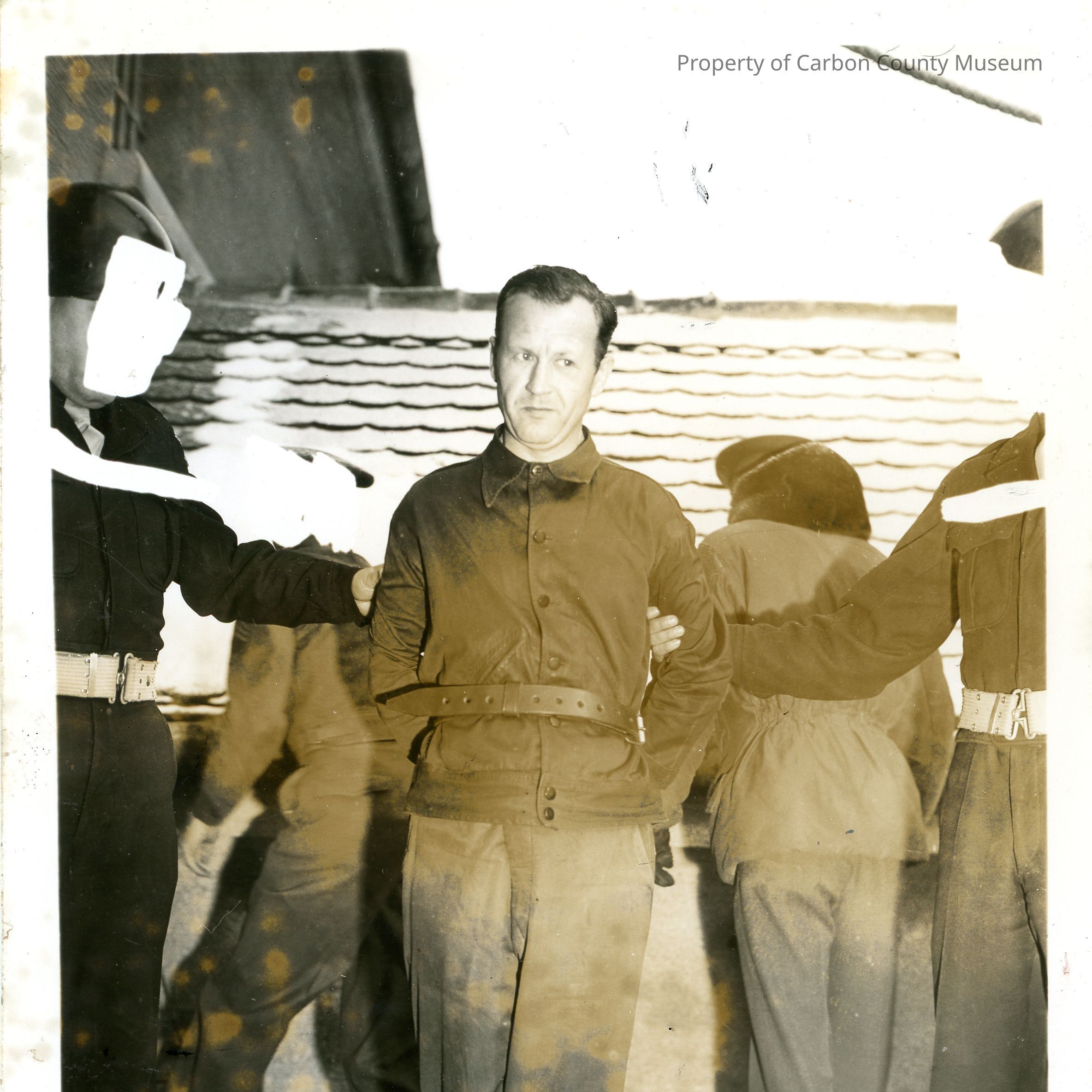 Black and white photograph. A man wearing a prisoner uniform is held in place by two men wearing military uniforms - the faces and ranks of the two are scratched out. Behind the three are two men in military uniform, their backs are to the camera - the man on the left has his face scratched out. On the reverse is printed the following "Vetter, Helmut Execu WCPL 2 Feb 49".