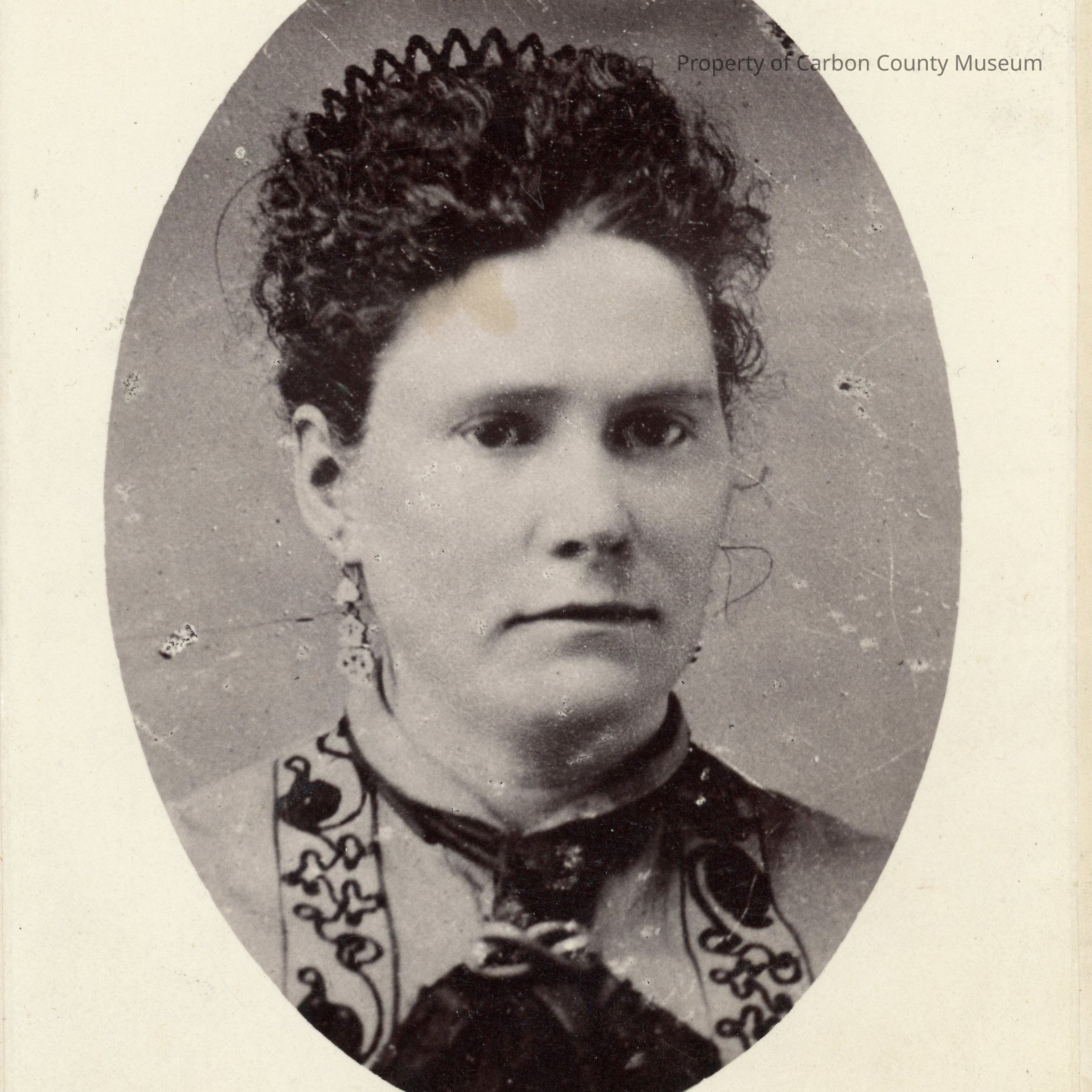 Update 2008: Black and white photo affixed to 2 1/4 x 6 3/8, ivory colored matboard. Print has oval portrait inside white border. Photo shows a woman with dark hair in a curly updo with a crimped hair decoration going across top back edge of hair at crown. She has dark eyes. She is wearing a high neck blouse with a black neck tie that is narrow at neck edge, pinned at neck front and spreads at bottom edges at bodice front. There is black soutache braid in decorative design on each side of center front extending down from shoulders . She is wearing long dangling earrings. Dress itself is light colored.