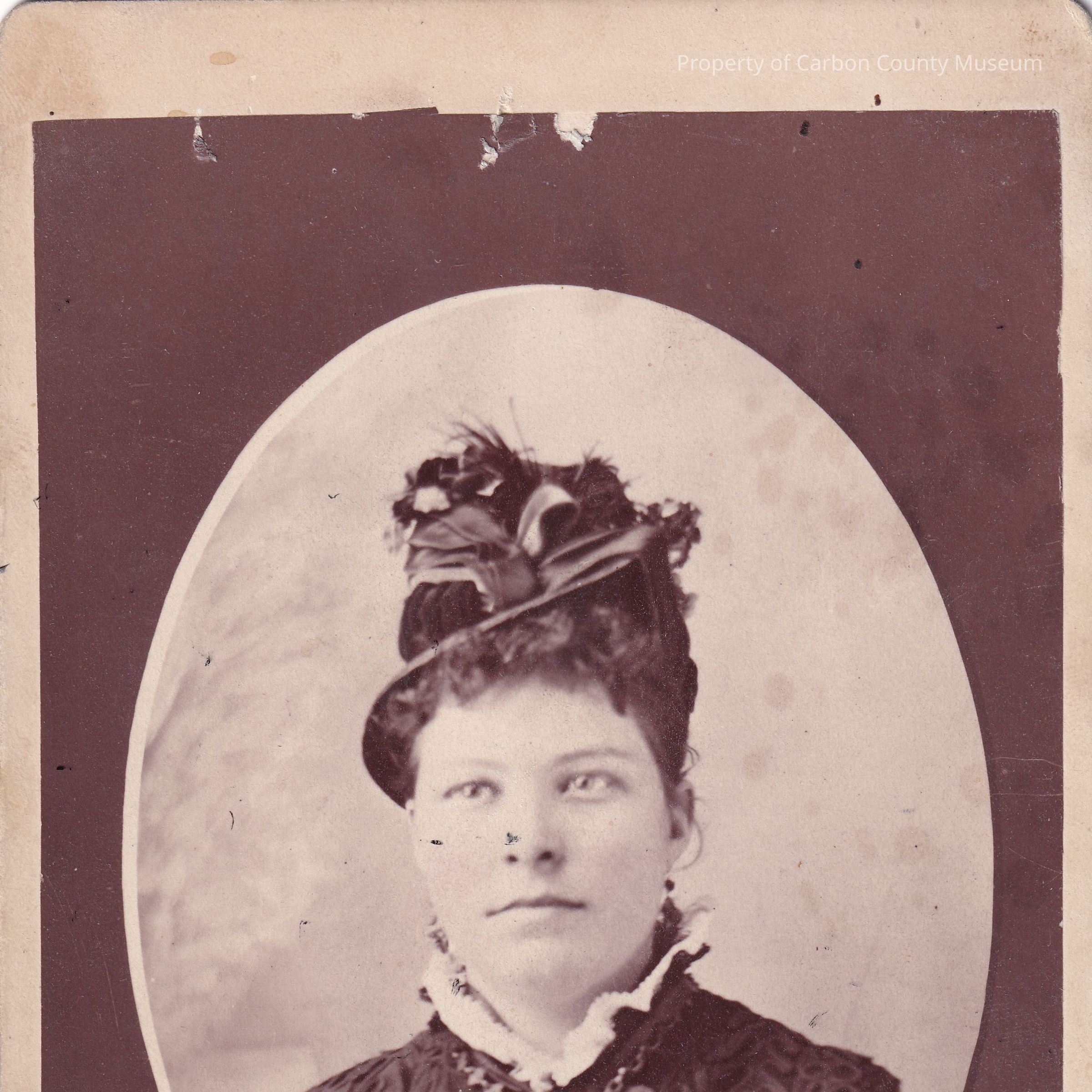 Cabinet card photograph, black and white studio portrait of a young woman, the reverse of the card is decorated with geometric patterns inside of circles.