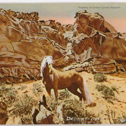 A picture post card of Desert Dust-the Wild Palomino Stallion photographed by Verne Wood in the Red Desert of Wyoming on July 12, 1945. Measures 3 1/2" x 5 1/2". Printed notation reads photographed with his band of 18 mares and 12 colts in the Red Desert of Wyoming on July 12, 1945. Original photographic copies hand painted in oils can be obtained by writing Verne Wood , Box 381, Rawlins, Wy. (He passed away in 1979.) On back: POSTCARD; Place Stamp Here. Condition good.Collection