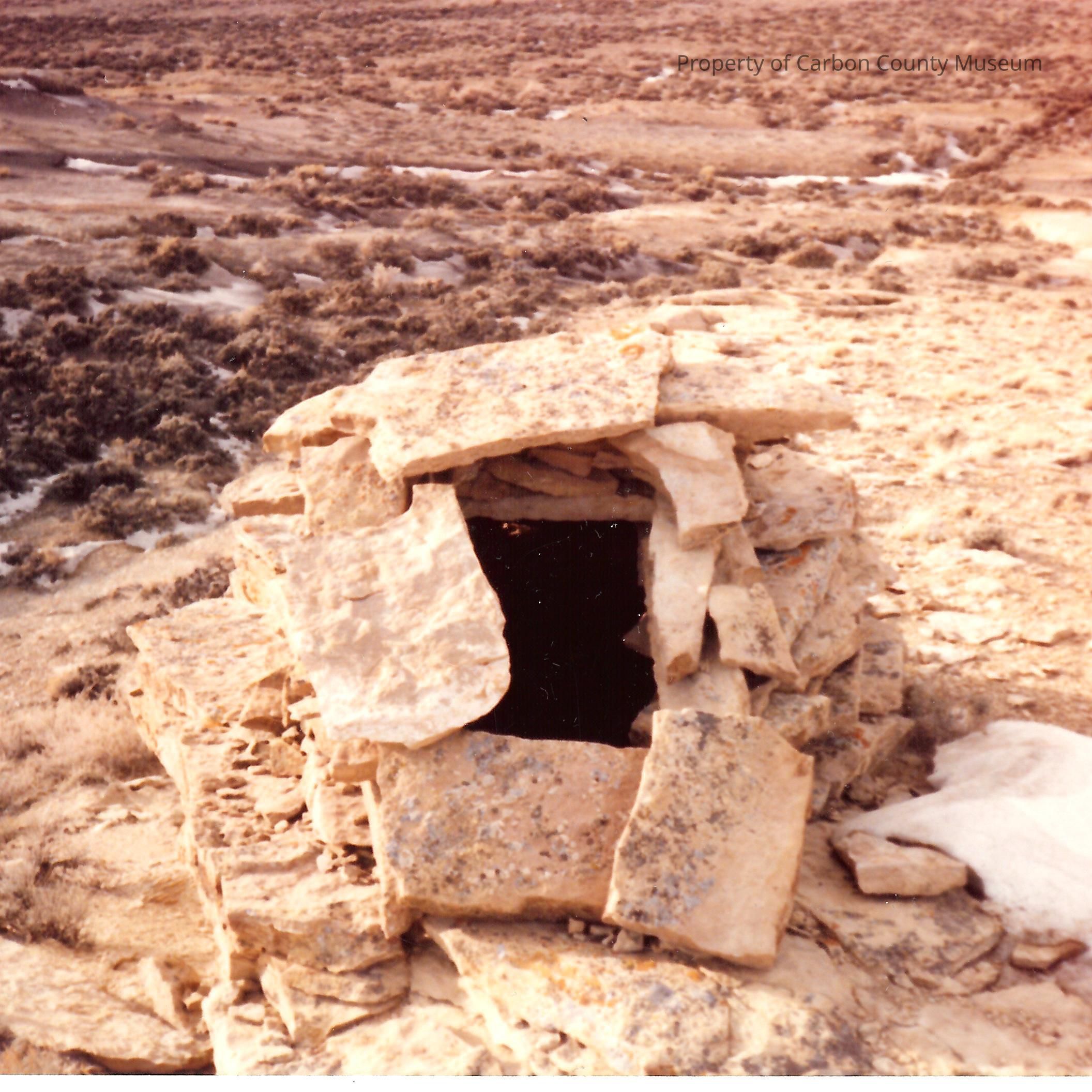 A colored photo 3 1/2" x 5" of an eagle catching trap possibly taken near NW Adobe Town Rim. Desert background, flat lichen rock stacked 16 high in center of photo. Front view, snow shows in minimal areas on the ground surrounding object. Dark hole area is visible into trap. Good condition, light coloring to print.Collection