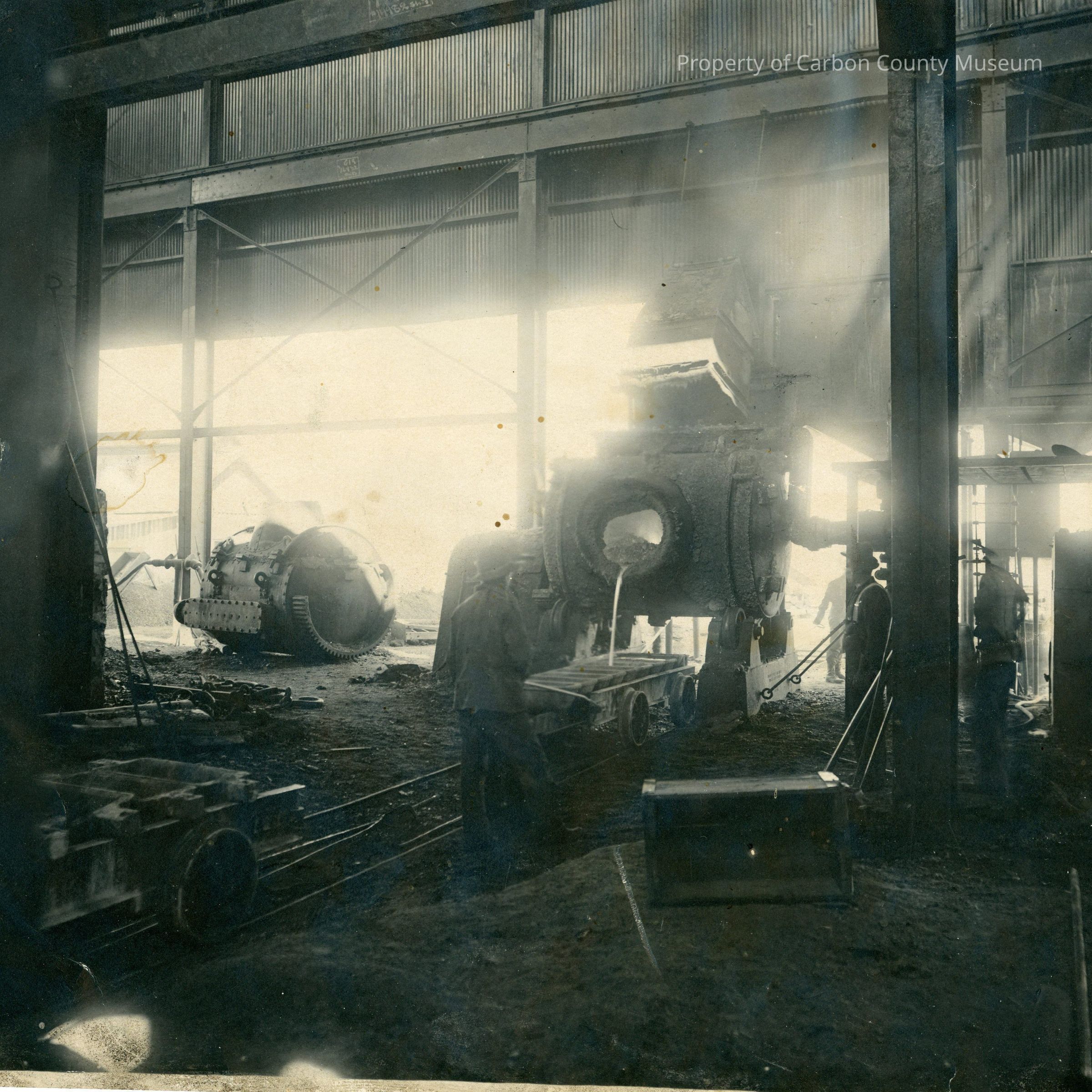 Update - 2009: Black & white print attached to a ragged edged corrugated cardboard. Image shows the interior of a very large dirt floored room with floor to ceiling beam support on right. The back wall is a corrugated sheet metal structure which is raised to a mid level on side left & center and at a lower level on side right. there is a drum like smeltering furnace with a pothole like opening on front side through which molten or is poring out into multiple ingot trays loaded on a small ground level four wheeled low level cart. This cart is on a dual rail track on which another cart is seen at a distance in front of it. A man wearing dark clothing & a hat is standing in front of the ingot cart. There is other smelter equipment in this room including a boiler? lying on the ground at side left & other unknown units with multiple small pipes on side right. Photo is dark in foreground & daylight creates rays & shadows on print surface at center & side right.