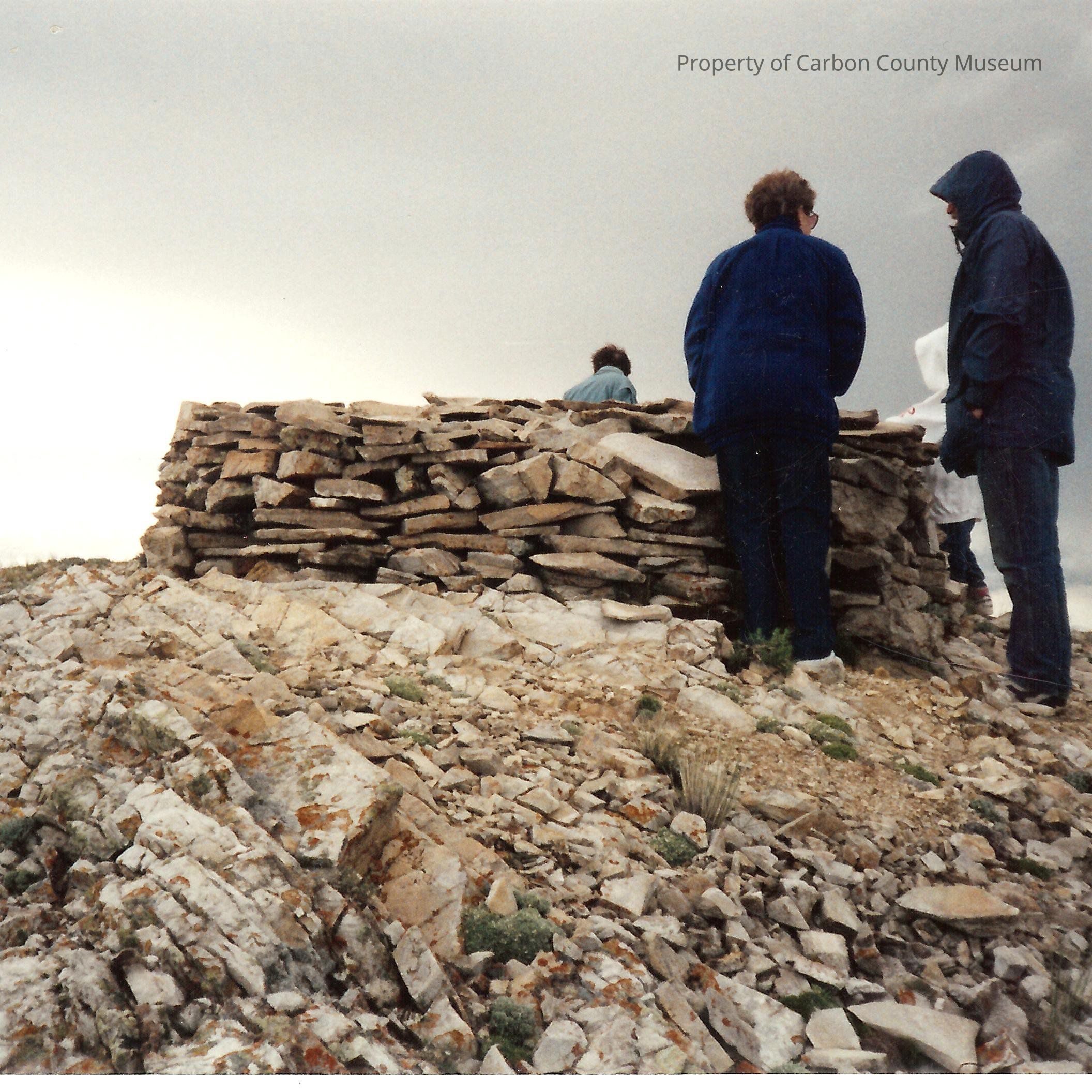 A colored photo 3 1/2" x 5" of an eagle catching trap possible taken near the East Slde of the North End of Wild Horse Mountain. Photo is a side view of Photo # 2004.217.9.3 and 5. Photo also depicts a woman in navy jacket, standing next to person with navy jacket and hood . Another person stands to far side of the trap. Good condition with dark color to print.Collection