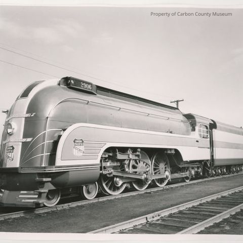 One 8 1/2 x 10 3/8" black & white scanned print. Caption printed on lower margin: "Passenger train 1904. Courtesy of Carbon County Museum All Rights Reserved".