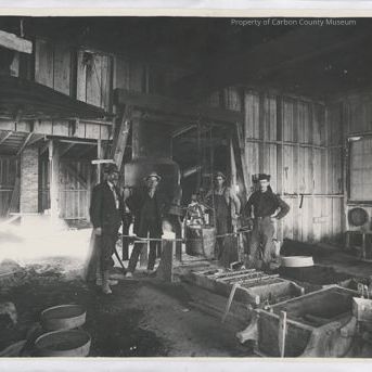 Update - 2009: Black & white print showing the interior of a large, rough finished wooden structure with a dirt floor. There are four men standing behind & to the side of a large bucket suspended by a chain pulley & a wide horizontal thin pipe through connecting curved metal hooks which are part of a U-shaped metal support of the bucket which is attached to the pulley chain. The pulley is attached to a large beamed support structure. There is a dark boiler looking object with a long narrow pour spout extending to the bucket. Other equipment is seen in foreground & on side left. A white area is seen at side left center. It's origin is unclear. Very large dark bellows are seen mounted on to left side wall by wood bracket supports.