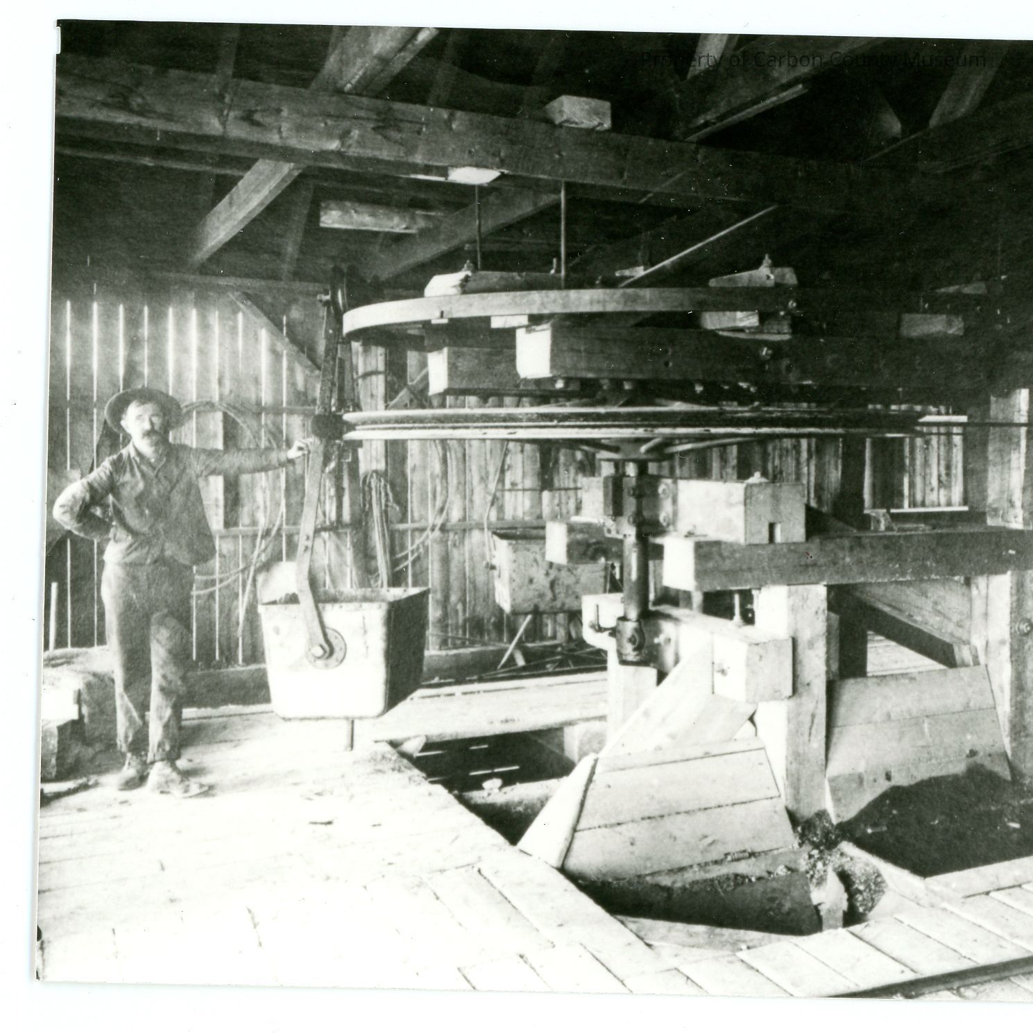 Update - 2009: Black & white print showing the interior of a large wooden structure with wooden vertical slat type walls (daylight is seen through space between the boards). The ceiling area has dark heavy looking support beams exposed. The center of the planked floor has a cut out area with a wooden structure built of different angles at different sections with similar pitched sides. The area above these wooden wide "V" areas are support timbers. At side left of this device is a black pipe above which is a thin cylindrical pulley wheel to which are buckets, all able to be tracked into the area. An ore bucket with the number 100 marked in white on side is seen in the tracking groove side left with a standing workman resting his extended left arm on the support bracket. His right hand is resting on his waist at his side right. Ore bucket number 102 is barely visible at side right. There appear to be holes in the floor around the wooden structure.