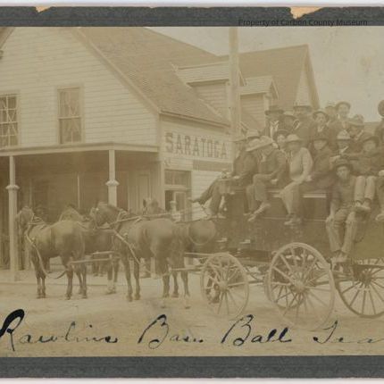 Sepia toned photo attached to black matboard of the Rawlins Baseball Team of 20 boys/men. The men are sitting close together with their legs hanging off the sides of a wagon pulled by four horses which is stopped in front of the Wolf Hotel in Saratoga, WY. Measures 5 1/2" x 3 3/4". Photo was given to donor by Con Ryan in the mid 1970's.
