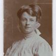 Update 2009: Sepia print. Studio portrait. Head and shoulder portrait of a young woman in a white dress, blouse that has lace collar and yoke. She is wearing a broach at center neck on collar. Her hair is tied with a large white bow and she is wearing oval, frameless glasses.