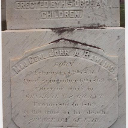 A 4" x 6" close up photo of the tombstone of Major General John Rawlins, difficult to read. Believed to say: Top reads Erected By His Orphan Children, Major General John A. Rawlins Born Feb. 13, 1834, Died Sept 6, 1869, Chief of Staff to General S. Grant from 1861-Jan 1869 at the time of his death Secretary of War? Similar to photo number: 2005.964.6.2.