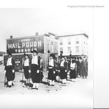 A CD that contains a black and white photograph of Henry Blickfeldt's Blacksmith Shop located at 4th and Buffalo. A Shrine parade is in progress in foreground. Left hand side of photo shows Ferris Photo Studio in background. Right hand side of photo shows the Ferris Hotel. CD in case measures 4 7/8" x 5 5/8."Collection