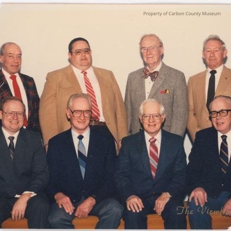 Updated 2009: Color print of 8 men, 4 standing and 4 sitting. All are dressed in suits and ties. In bottom right corner in gold ink: "The Viewfinder". Stamped in black rectangle on back: "Copyrighted photograph. This photograph is not to be reproduced, televised, or copied in any form without written permission". "Copyright 1988 the Viewfinder". "2449 Ri- 4/5". In black ink : "Back row left to right: Norman Palm, Kendall McBride, Ted O'Melia, Jack Williams. Front row: Dave Norman, Harold Penland, Kay Anderson, Ed Smyth. Westland Federal Savings and Load Board."