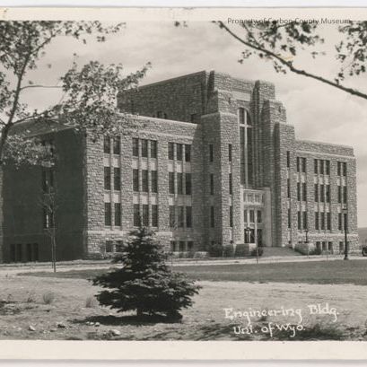 Update 5/2010: Black and white print card of multi level stone building. Center of building is taller and has tiered front sections above pillars that extend to ground. Between pillars are the doors and above them is a large arch with sectioned windows. To either side are four levels of foreground. Two vintage cars are parked on street in front of building. Printed in white on bottom: "Engineering Bldy. Uni. of Wyo."