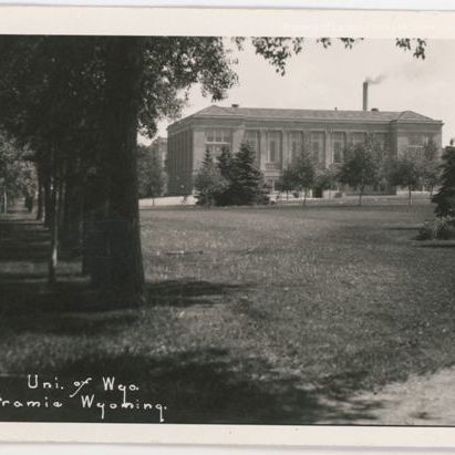 Update 5/2010: Black and white print card of large multi level building. Center of building is inset from ends. Large windows are bordered by brick extensions from building . A row of trees is in front of building. On photo left are two rows of large trees. Lawn covers area in foreground. Written in white on bottom: "Library Uni of Wyo. Laramie, Wyoming."