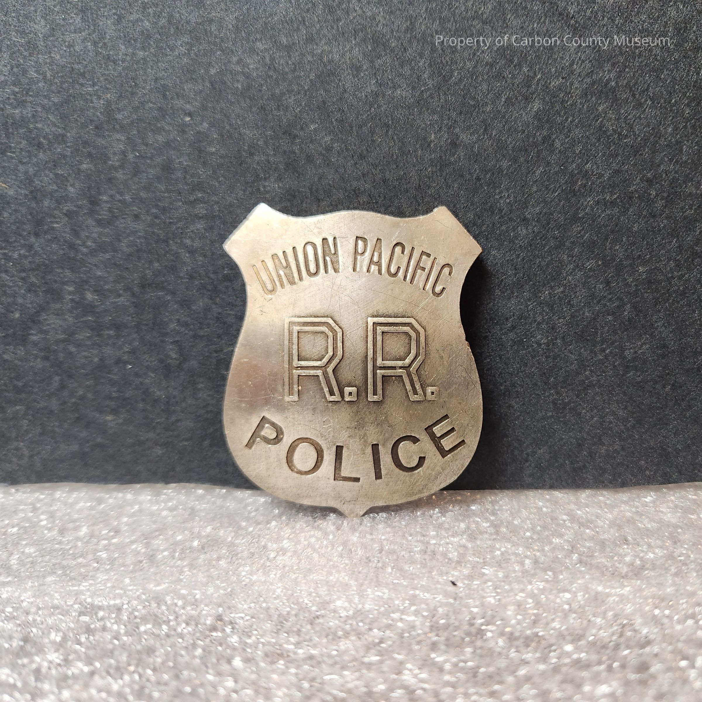A shield style badge. The front has an inscription that reads "UNION PACIFICA R.R. POLICE". The reverse has a safety pin soldered in place.