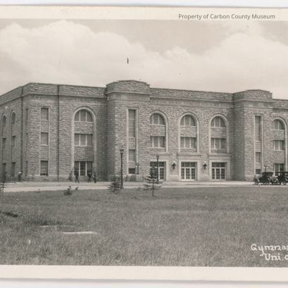 Update 5/2010: Black and white print card of multi-level stone building. Building has arch windows on top level. Two small sections on front extend out beyond main building. Three men work in front of building on left. Two vintage cars are parked in front. Light poles with glass globes at top are seen near building. Printed in white at bottom right: "Gymnasium Uni of Wyo."