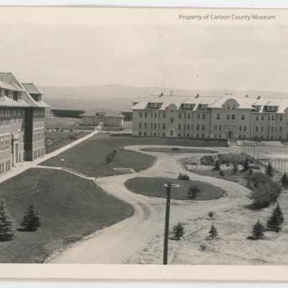 Update 5/2010: Black and white card of two large multi-level buildings and one smaller one in the distance. Larger ones look like possible dormitories. In photo center are 2 circular dirt roads around grass plots. Small evergreen trees and grass are around roads and sidewalks.