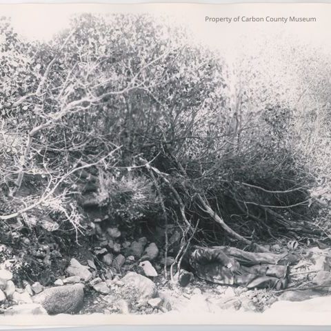 Update 1/2008: Black and white print. Snapshot. Image of a "body" lying in a rocky ravine under overhanging brushes, brush and dead wood. "Body" is face down and is dressed in coat, white shirt, chaps, boots and hat.
