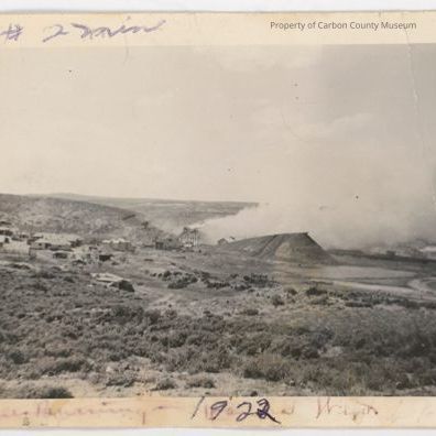 Update March 2011: View 3 - On photo left are buildings & on right is smoke from mine & piles of dirt. Brush in foreground. Written on top border "#2 Mine". Written on bottom border: "Tipples Burning Hanna, Wyo 1922"