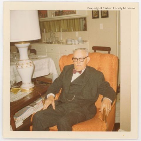 An undated photo of Dr. Jeffrey when older. A 3 /12" x 3 1/2" colored snapshot of him wearing a black three piece suit sitting in an orange colored easy chair.