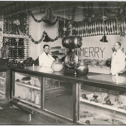 Update 2009: Black and white contact print. Image of the interior of a market decorated for Christmas. Two men in white coats standing behind display case/counter. Large scale and large glass jars on counter top at center; cash register on counter at left. Displays of meat an milk inside case. Fruit displays in background at left.