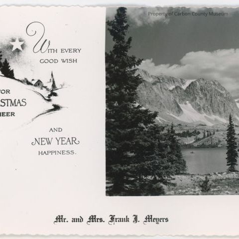 A black and white undated Christmas postcard with a greeting printed on the left side and a picture of the Snowy Range on the right with Lake Marie ? in the foreground. The name Mr. and Mrs. Frank J. Meyers is printed in the middle of the card at the bottom.