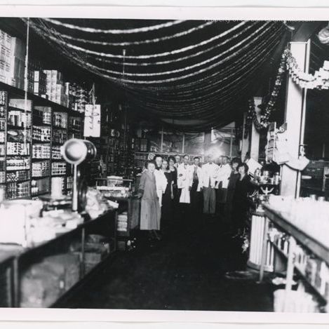 Update 2009: Black and white contact print. Image of the interior of a general store decorated with garlands across the ceiling. Group of men and women, (7 men in white coats/5 women) posed at center background. Canned and dry goods on shelves along wall at left side of image. Display cases/counters in front. Display tables along right side.