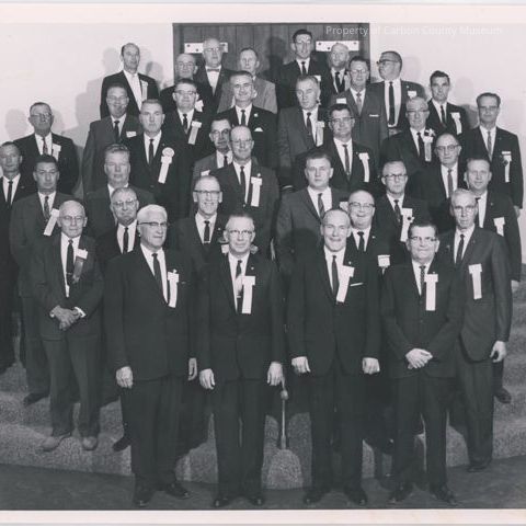 An 8" x 10" black and white glossy print of the Union Pacific Old Timers Club. Depicts seven rows of unidentified men standing on carpeted steps. All are dressed in suits and ties with delegate? ribbons hanging on their left lapel.