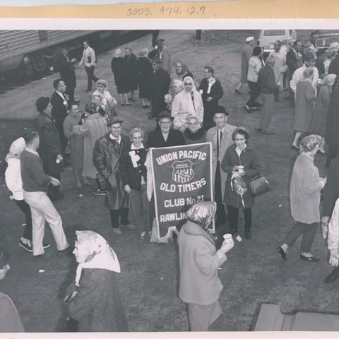 An 8" x 10" black and white glossy print of the Union Pacific Old Timers Club. Depicts a group of men and women to the side of a train car. Several are holding up a Union Pacific Old Timers Club No 21 Banner. Several women are wearing coats and have paper cups in their hand. Besides the people looking into the camera, many people are mingling and are in the process of walking away. Photo is stuck on a piece of construction paper.