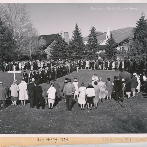 An 8" x 10" black and white glossy print of the Union Pacific Old Timers Club. Depicts a group of men and women attending a ceremony. There is a cross in the foreground with a row of men in dark suits in front of it. Other people are circled around these men with expanse of grass on each side of the row of men. A church with a steeple is in the far background. People are nicely dressed and most are wearing coats and jackets. Bottom of photo is written Sun valley 1964. Photo is stuck on a piece of construction paper.