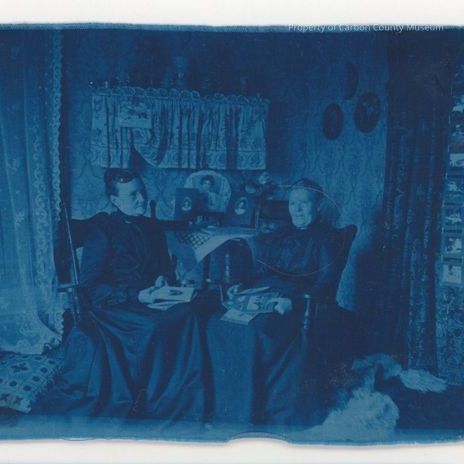 Update - January 2010: Cyanotype printed on fabric. Print is varying shades of blue. Image shows two older women wearing dark, long dresses, sitting in high back wooden chairs holding photographs in their laps. A short lace curtain is hanging at wall behind them & a long lace curtain is seen at side left. There is a tapestry pillow on floor & framed photos on table at center behind them.