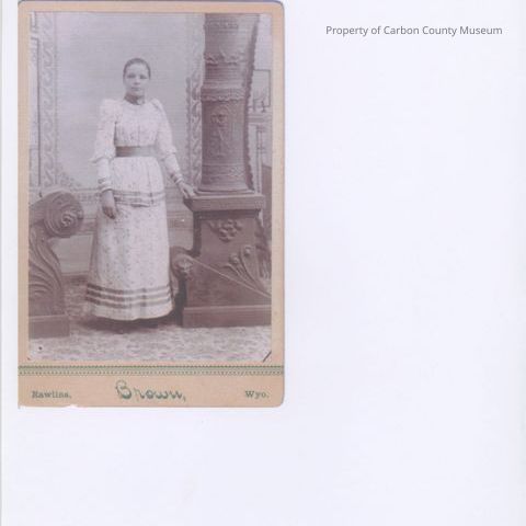 A photocopy of a cabinet card of Lena Settergren standing by a dark colored column with a 2 piece light colored, with tiny floral print, dress with dark ribbon? belt. Dark colored grosgrain ribbon decorates the bottom of the blouse edge as well as both sleeves on the cuffs. Three rows of ribbon decorate the lower half of the skirt at bottom edge. Her dark hair is pulled back from her face. Her left hand is resting on the center base of the column. Photo by Brown, Rawlins, is imprinted on bottom in green ink. Copy of print measures 4 1/4" x 6 1/2" on a sheet of 8 1/2" x 11" copy paper.Collection