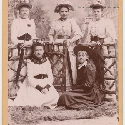 A studio photograph of Lena Settergren (a relative of Matilda Brown and Annie Kocken) and friends. Three young women all standing behind rail fence and 2 girls are seated on fur type rug. 4 1/4' x 6 1/2'.