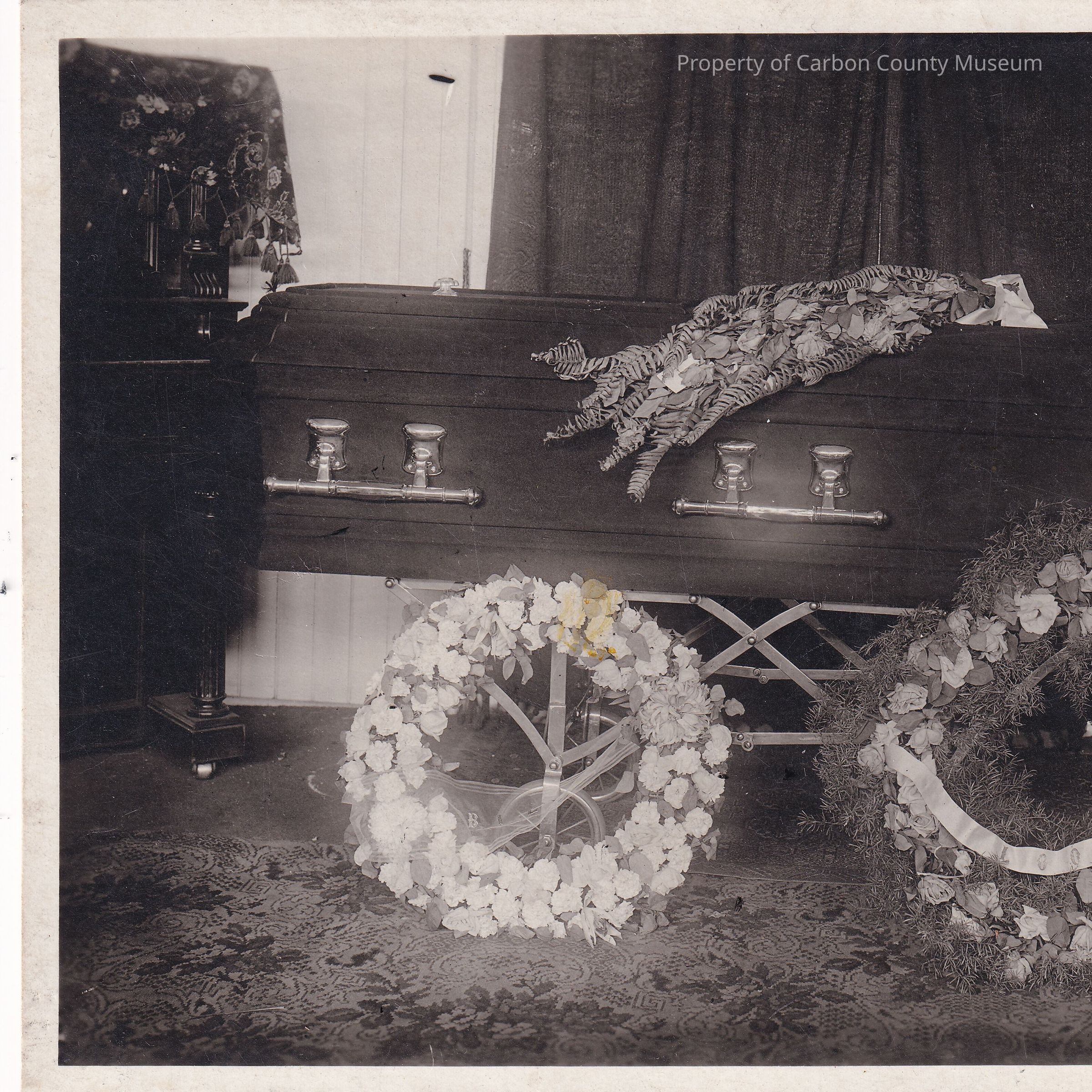 A black and white photograph of a closed casket, flowers are draped over the top of the casket while two floral wreaths are propped against it, on wreath has a banner that reads "Loom", on the reverse "Mollie Rimie" is written in blue ink, the remnants of a grey backing are present.Collection