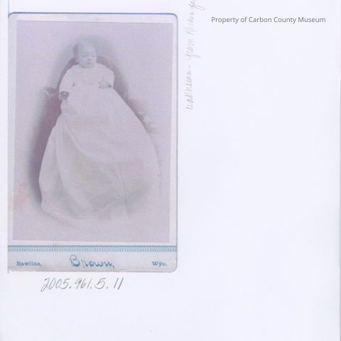 A 4 1/4" x 6 1/2" photocopy of a sepia toned studio photo of a baby in a long christening gown taken by Brown, Rawlins, WY. Pale green edging along bottom.Collection