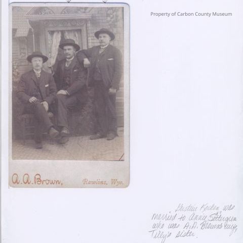 An A.A. Brown studio photo of 3 men. 2 seated, 1 standing, all in 3 pc. suits with hats. Man on far right is identified as Gustive Kocken, man in middle, Joseph Kocken, unknown man on left. Gold logo on bottom of photograph.Collection