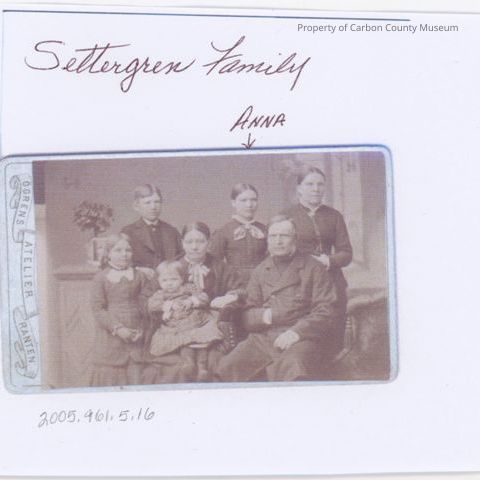 A photocopy of a studio print, 4 1/8" x 2 1/2" of the Settergren family with arrow depicting Anna Ogrens Atelier Ranten. Shows a man and wife holding baby with 2 older girls in back, young lad, small girl in front.Collection