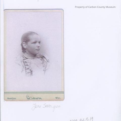 A photocopy of a print taken by A.A. Brown of Lena Settergren, profile with hair pulled back, high collar, puff sleeves. Rawlins, WY.