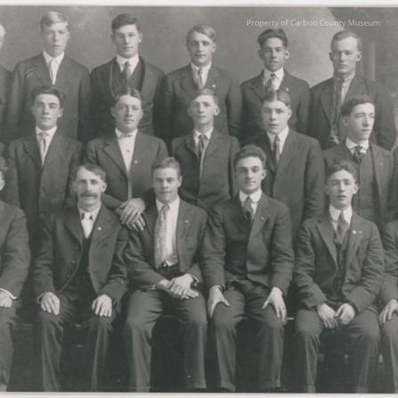 Photo of 19 men in the First WWI Draft. Bill Wright, Peter Henninipan, Richard Norris, Swat Milliken August Lappala, Alex Greenwood, Bill Russell, Jim McDonald, James Gaskell, Robert Wilson, Jim Meekin, Andrew Royce, Buck Jones, Bill Jones, John Whiles, Jack Cook, Tuffy Rider, Harry Shenatt. Two copies.
