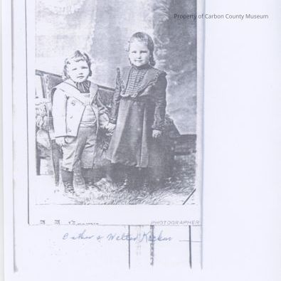A photocopy of a photo by A.A. Brown of toddler, Esther Kocken (wearing dk. colored long dress) and Walter (wearing a 3 pc. outfit: jacket, knee breeches, boots), curly hair. Both standing in front of sofa on furry rug.Collection