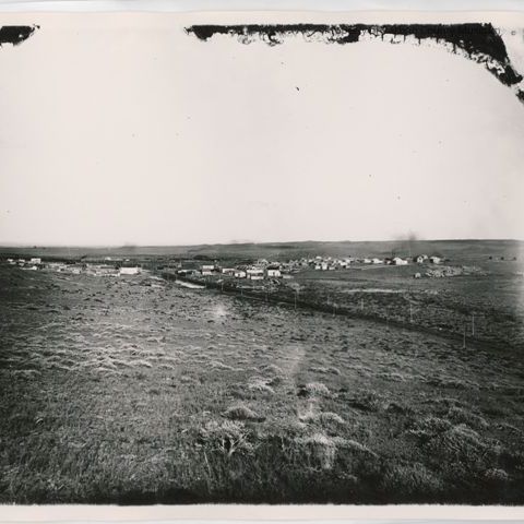 Update 2009: Black and white snapshot. Image from slight elevation of a small town in the middle of a sagebrush prairie. Train tracks run into town across the image on the near side of town. Smoke can be seen streaming from several tall smoke stacks throughout the town.