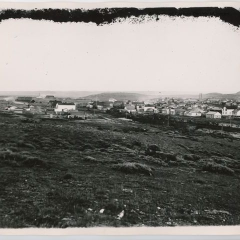 Update 2009: Black and white snapshot. Image of a small town on a sagebrush prairie. Train tracks running into town from right side of image. Gang of men can be seen working on the tracks. Low hills in background.